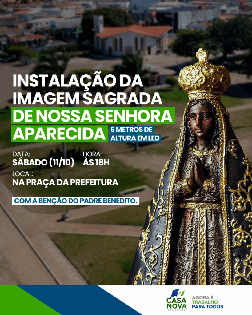 A fé e a devoção do povo de Casa Nova ganham um novo símbolo de amor e esperança com a instalação da imagem Sagrada de Nossa Senhora Aparecida, padroeira do Brasil. Com seis metros de altura e iluminação em LED, a escultura será instalada na Praça da Prefeitura, trazendo ainda mais beleza e encanto ao coração da cidade.