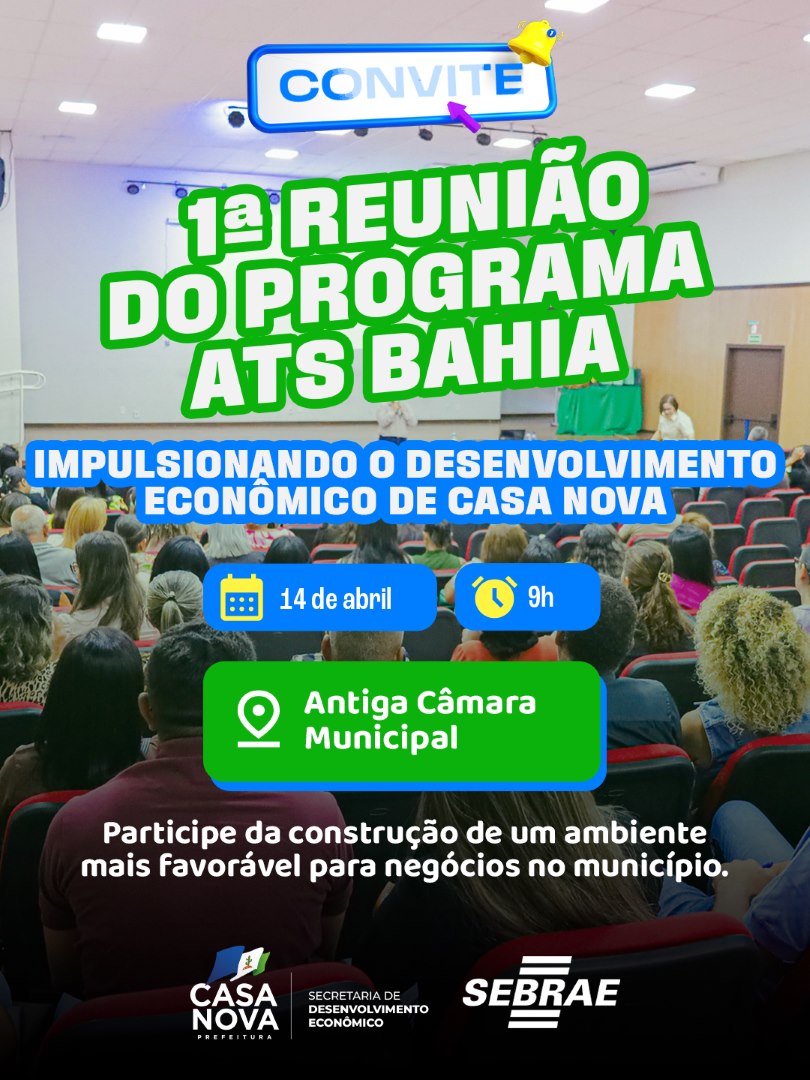 A Prefeitura de Casa Nova realiza, nesta terça-feira (14), às 9h, na antiga Câmara Municipal, a primeira reunião oficial para apresentação do Programa Agente Territorial SEBRAE Bahia (ATS BA), iniciativa do Sebrae que vai apoiar o município na melhoria do ambiente de negócios e no fortalecimento da economia local. A proposta é ajudar a gestão pública a organizar informações, identificar prioridades e colocar em prática ações mais eficientes para quem empreende ou deseja empreender na cidade.
