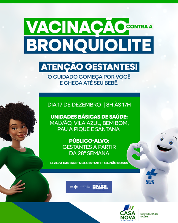 A proteção começa ainda na gestação. A vacina contra o Vírus Sincicial Respiratório (VSR), principal causador da bronquiolite, já está disponível nas Unidades Básicas de Saúde de Casa Nova. Para ampliar a conscientização e incentivar a imunização, a Prefeitura Municipal, por meio da Secretaria de Saúde, realiza nesta quarta-feira (17) uma ação especial de vacinação voltada para gestantes.