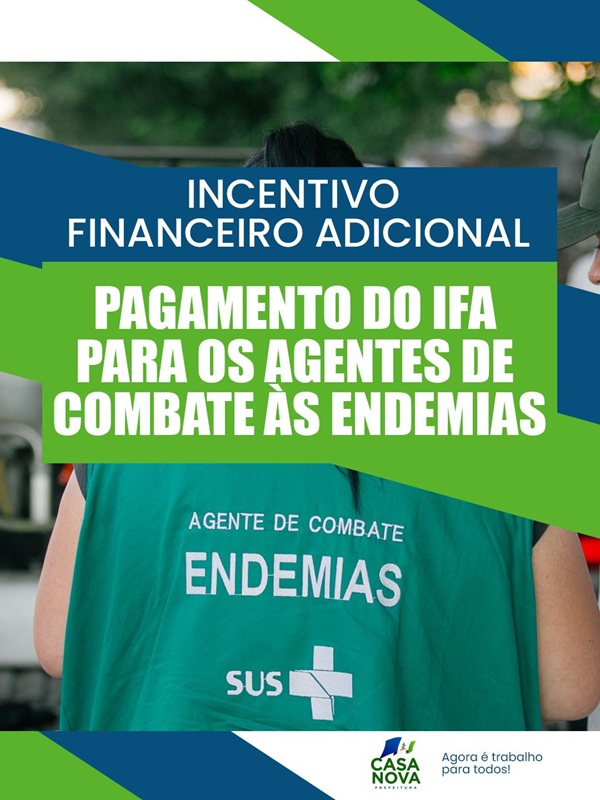 A gestão Aniso Viana segue demonstrando, na prática, o compromisso com a valorização de quem cuida da população. A Prefeitura de Casa Nova realiza nesta data o pagamento do IFA – Incentivo Financeiro Adicional aos Agentes de Combate às Endemias, ainda dentro do ano, garantindo respeito e reconhecimento a esses profissionais.