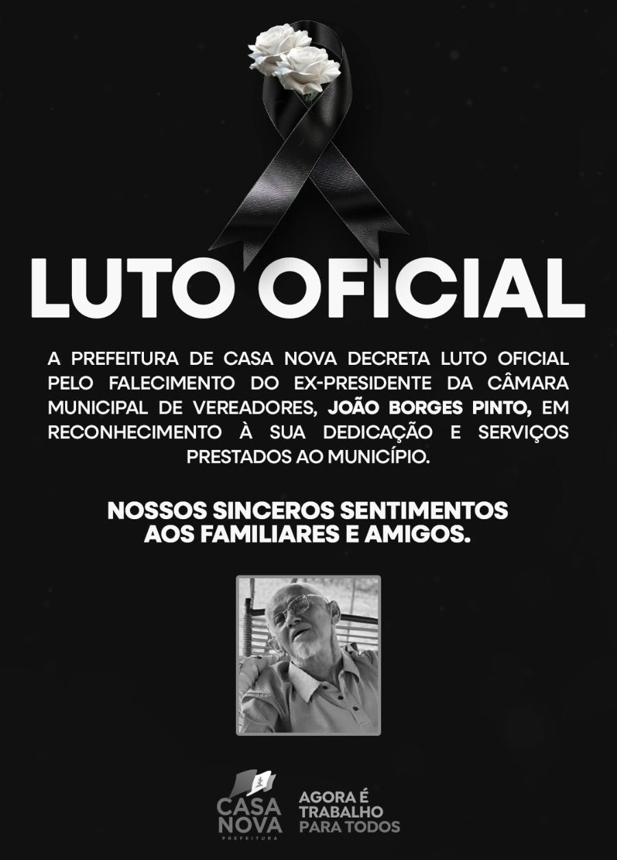 A Prefeitura de Casa Nova lamenta profundamente o falecimento de João Borges Pinto, ex-vereador, ex-presidente da Câmara Municipal e pai do atual presidente da Casa Legislativa. Reconhecido por sua trajetória de dedicação à vida pública e pelos relevantes serviços prestados ao município, João Borges Pinto deixa um legado de compromisso e respeito à comunidade casanovense.
