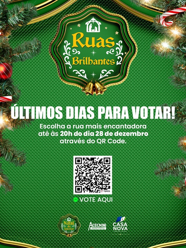 A população de Casa Nova tem até este domingo (28) para dar o seu voto e ajudar a escolher a rua mais encantadora do concurso Ruas Brilhantes. A iniciativa da Prefeitura Municipal, em parceria com a Associação Comercial de Casa Nova, vai premiar o talento das comunidades que transformaram suas ruas em verdadeiros cenários natalinos.