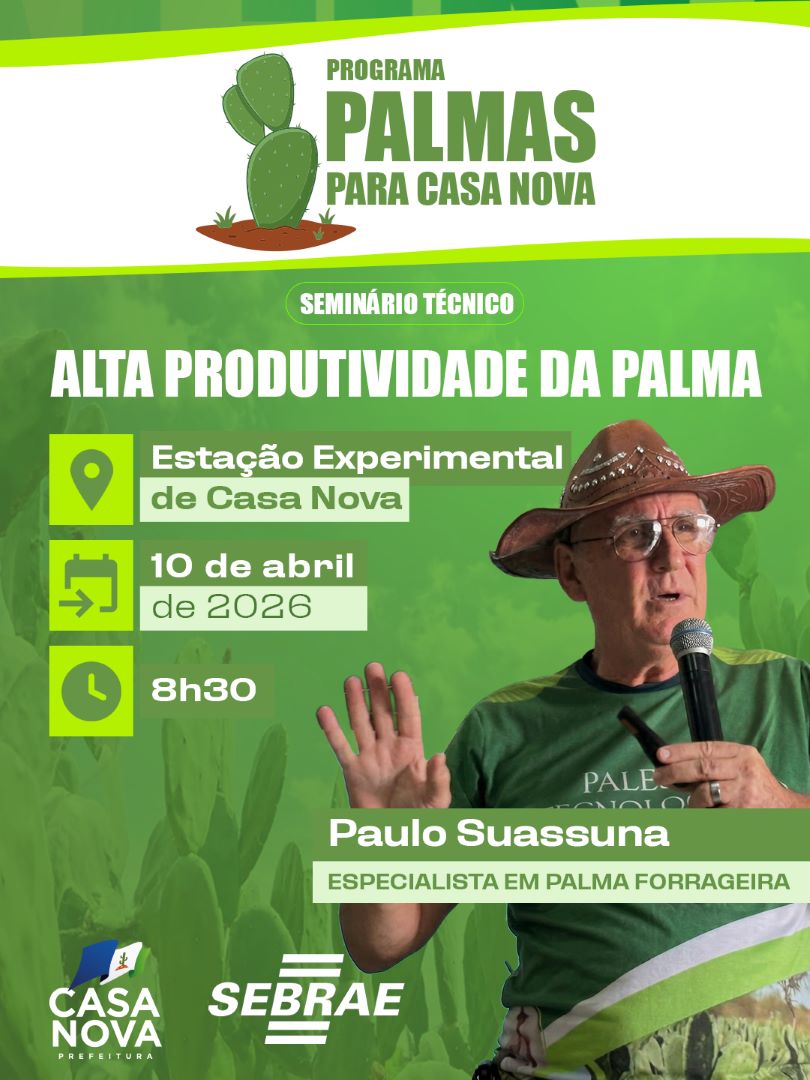 A Prefeitura Municipal de Casa Nova, por meio da Secretaria de Agricultura, Pecuária e Pesca, realiza nesta sexta-feira (10) o seminário técnico voltado à alta produtividade da palma forrageira. O evento acontece a partir das 8h30, na Estação Experimental de Casa Nova.